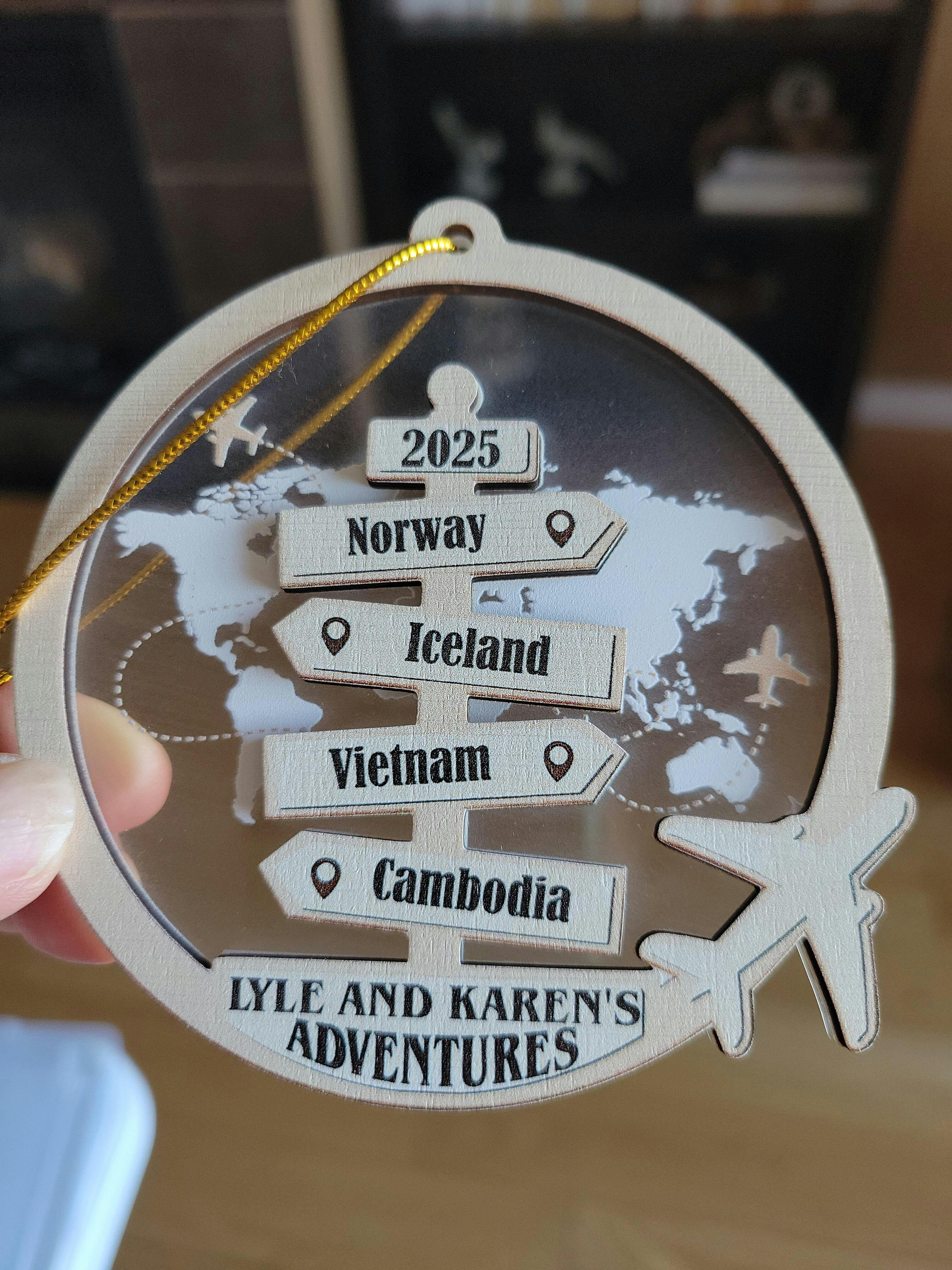 Beautifully crafted with a layered design and personalized travel details, this unique and delightful ornament brings your favorite destinations to life. Hang it on your Christmas tree, display it in your home, or pack it for a travel keepsake to cherish every adventure.